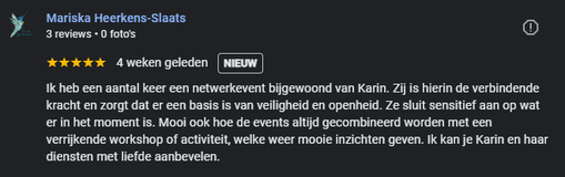 "Dankjewel Karin voor een fijn netwerkevent waar verbinding en aandacht oprecht voelbaar waren. Een fijne locatie en jij als warme gastvrouw om het plaatje compleet te maken."